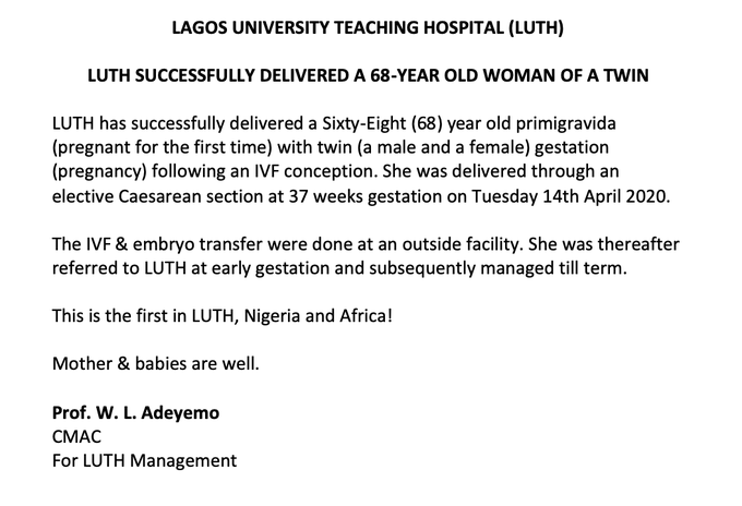 Adeyamo said, “LUTH has successfully delivered a sixty-eight (68) year old primigravida (pregnant for the first time) with twin (a male and a female) gestation (pregnancy) following an IVF conception. She was delivered through an elective caesarean section at 37 weeks gestation on Tuesday April 14, 2020.”