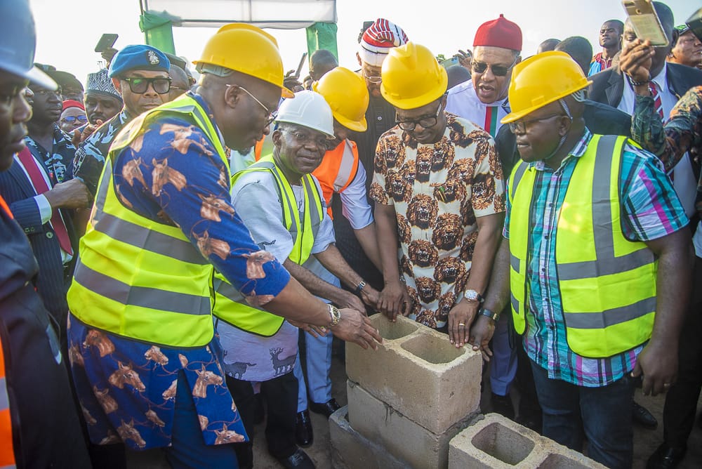 Cover pix: Gov Otti (wearing a white helmet), assisted by Rt Hon Benjamin Kalu (left) and others, laying the foundation of the AIIP at the ground-breaking ceremony.