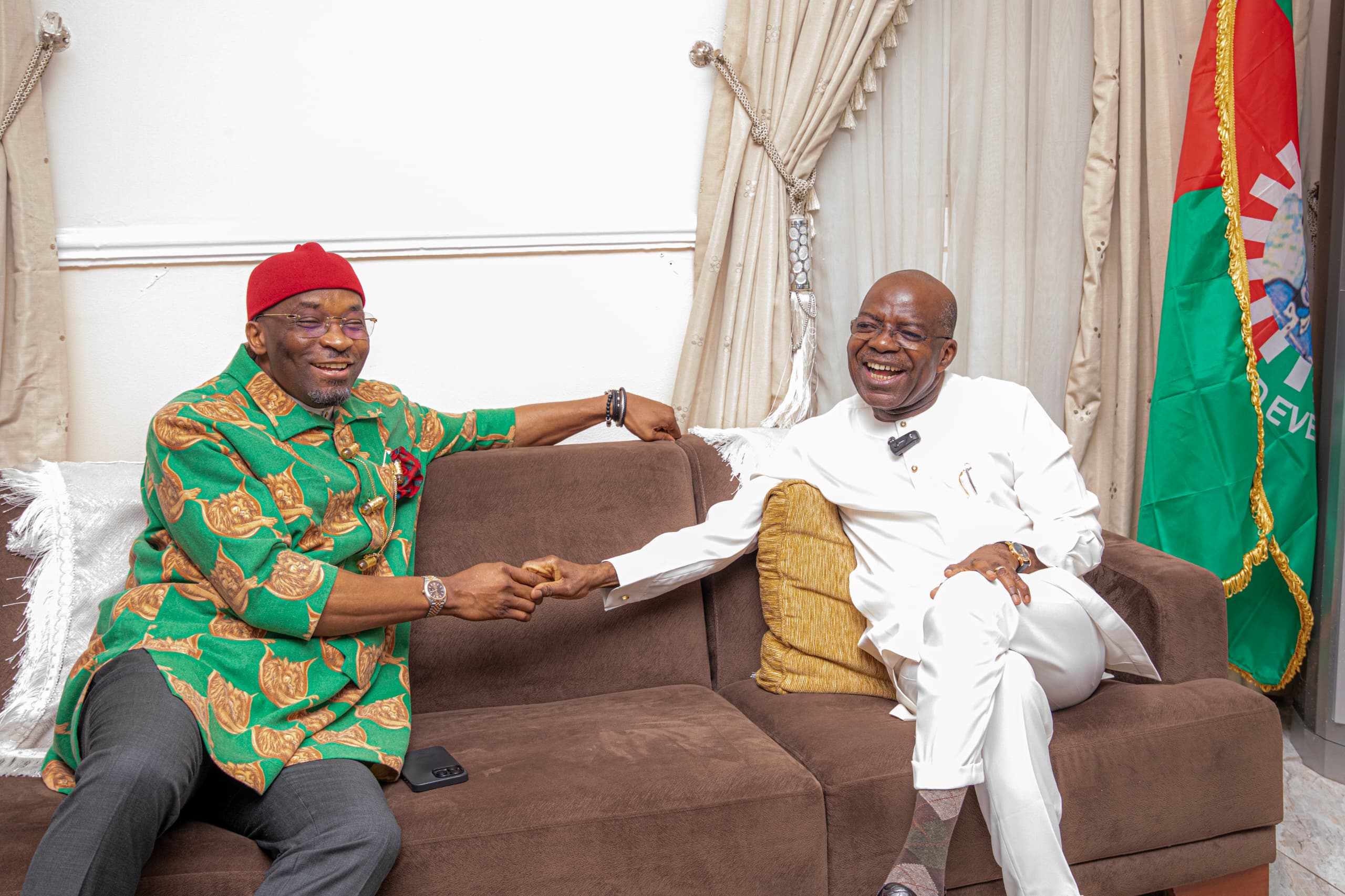 Cover pix: The Deputy Speaker of the Federal House of Representatives, Rt. Hon. Benjamin Kalu (left) and Abia State Governor, His Excellency, Dr. Alex Otti, OFR. Kalu on Friday visited Governor Otti at his residence in Nvosi, Isialangwa South Local Government Area, to, among other things, thank the Governor for the honour given to him when the State held a homecoming reception for him in December of last year, 2023.