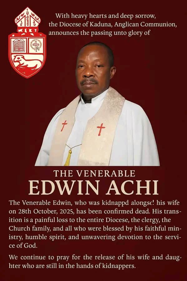 Ven. Edwin Achi, who was kidnapped alongside his wife on 28th October, 2025, has been confirmed dead. His transition is a painful loss to the entire Diocese, the clergy, the Church family, and all who were blessed by his faithful ministry, humble spirit, and unwavering devotion to the service of God.