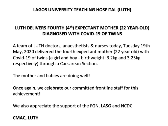 The tweet read, “A team of LUTH doctors, anesthetics and nurses today Tuesday, May 19, 2020, delivered the fourth expectant mother (22-year-old) with COVID-19 of twins; a girl and a boy.