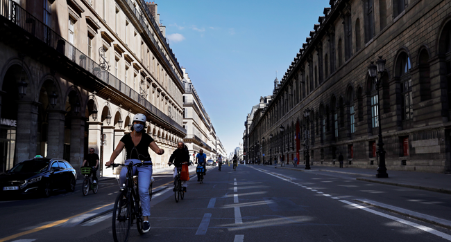 Cover Pix: People cycle with their bike down the Rue de Rivoli, by the Louvre museum, in Paris on May 19, 2020, as France eases lockdown measures taken to curb the spread of the COVID-19 (the novel coronavirus). THOMAS COEX / AFP