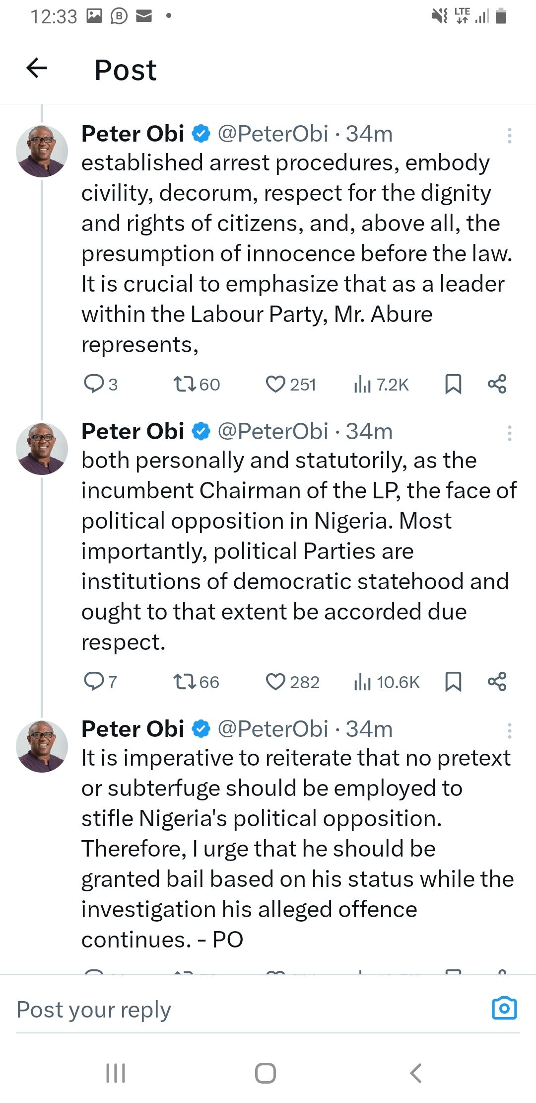 “I firmly believe that, as citizens, we are all duty-bound irrespective of our status in society to respond to invitations from properly constituted authority. My stance on this matter remains unwavering but does not explain watching the distressing image of our National Chairman lying on the ground in the name of arrest. This act is undesirable , demeaning and unequivocally intolerable and must be condemned by any decent and civilized mind within the context of our present civic landscape in Nigeria. These deplorable actions epitomize the pinnacle of rascality and serve to egregiously tarnish the already regrettable perception of our nation as one plagued by lawlessness”.