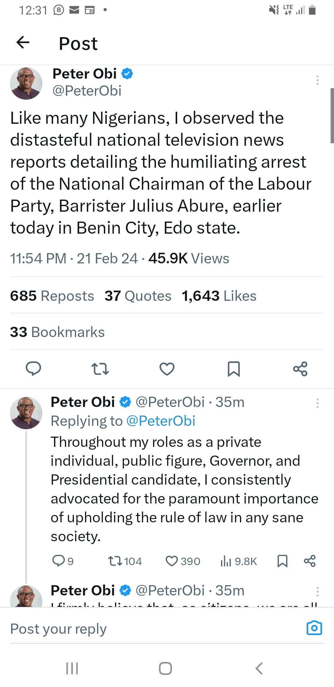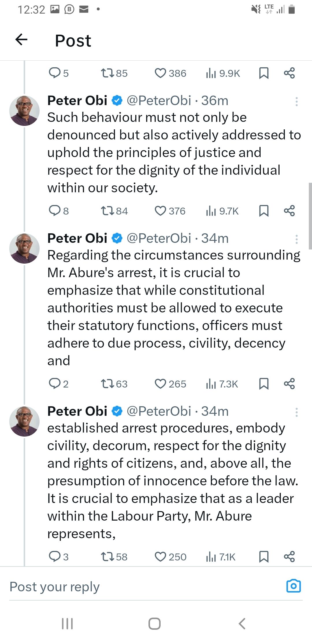 “Like many Nigerians, I observed the distasteful national television news reports detailing the humiliating arrest of the National Chairman of the Labour Party, Barrister Julius Abure, earlier today in Benin City, Edo state”.