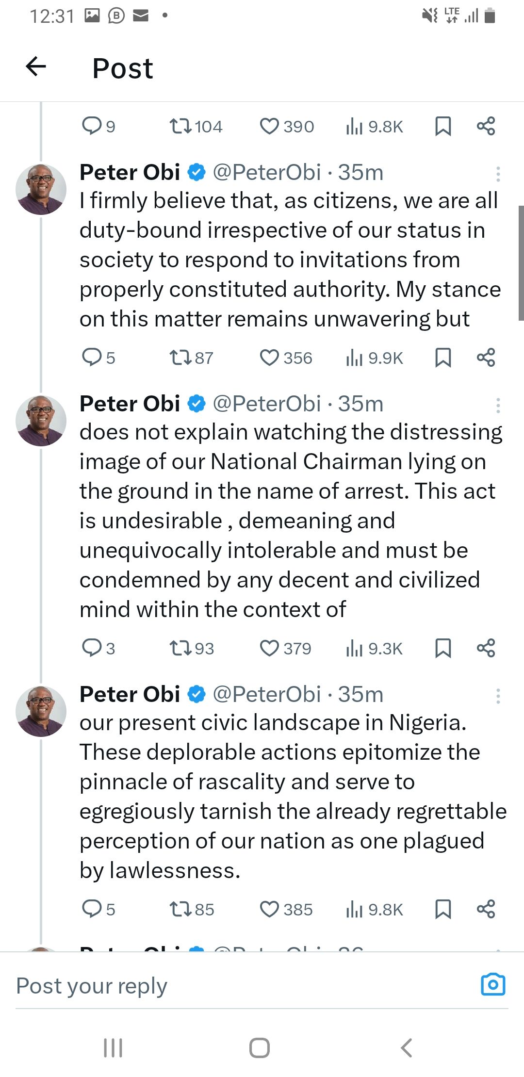 “I firmly believe that, as citizens, we are all duty-bound irrespective of our status in society to respond to invitations from properly constituted authority. My stance on this matter remains unwavering but does not explain watching the distressing image of our National Chairman lying on the ground in the name of arrest. This act is undesirable , demeaning and unequivocally intolerable and must be condemned by any decent and civilized mind within the context of our present civic landscape in Nigeria. These deplorable actions epitomize the pinnacle of rascality and serve to egregiously tarnish the already regrettable perception of our nation as one plagued by lawlessness”.