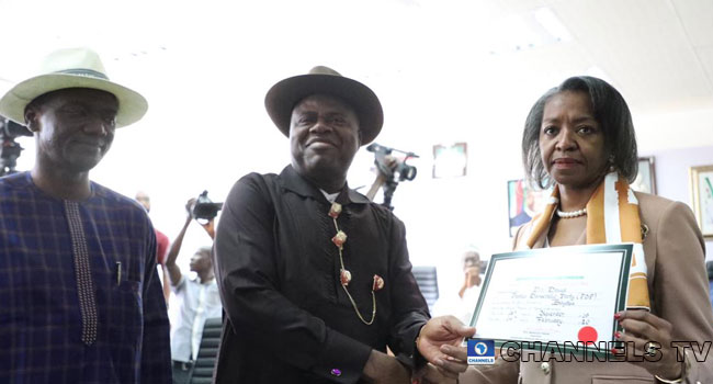 Shortly after declaring him winner of the November 16 Bayelsa governorship election, the Independent National Electoral Commission (INEC) has presented the Certificate of Return to Senator Douye Diri of the Peoples Democratic Party (PDP).