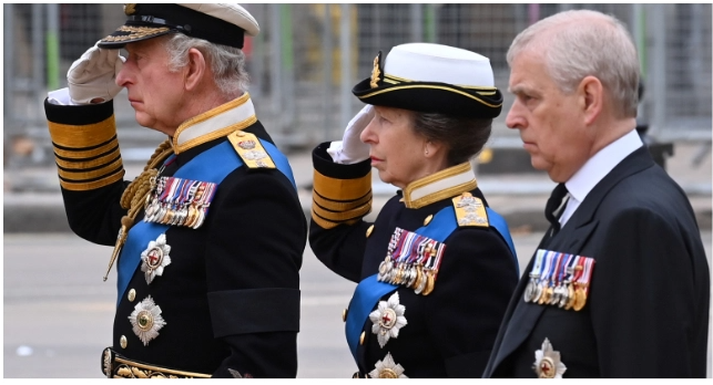 Britain’s Prince Andrew, Duke of York (R) stands as Britain’s King Charles III (L) and Britain’s Princess Anne, Princess Royal salute the coffin of Queen Elizabeth II as it arrives at Westminster Abbey in London on September 19, 2022, for her State Funeral Service. (Photo by Geoff PUGH / POOL / AFP)