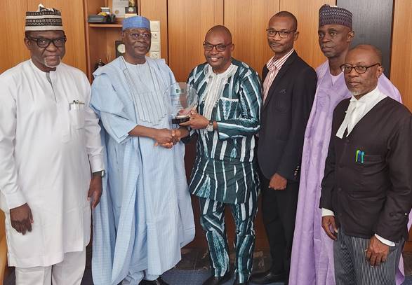 Cover pix: Executive Dir. Administration, Julius Berger Nigeria Plc, Bldr. Alhaji Zubairu Bayi, Fniob (2nd left) receives the corporate award to the company from the Group Head of CIOB Nigeria Hub, Bldr. Isiaka Adekunle Onabekun, Mciob (3rd from left); Management Staff of Julius Berger Nigeria Plc, Bldr. Abdulazeez Kaita, Fniob, (1st left); Julius Berger’s Bldr Akinboyede Ayokunle, Fniob; Bldr. Alao Abdulrazaq Ayo, Fniob; and Bldr. (Barr.) Babatunde Sobowale Osinubi, Fniqs, during the presentation of the award to Julius Berger Nigeria Plc in Abuja, recently.