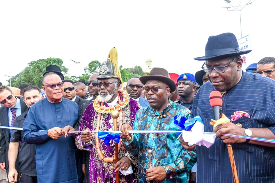 Cover pix: R-L: Senator representing Bayelsa West Seantorial District and former Beyelsa state Governor, Seriake Dickson, Rivers State Governor, Siminalayi Fubara, the Amanayabo of Abennema Kingdom, HRH Disrael Gbogbo Bob Manuel II Owukor IX, Project Coordinator, Julius Berger Nigeria Plc, Chief Sam Ngbor and Deputy Regional Manager, Julius Berger Nigeria Plc, Rimon Marisho during the cutting of the tape to officially commission t6he highway weekend
