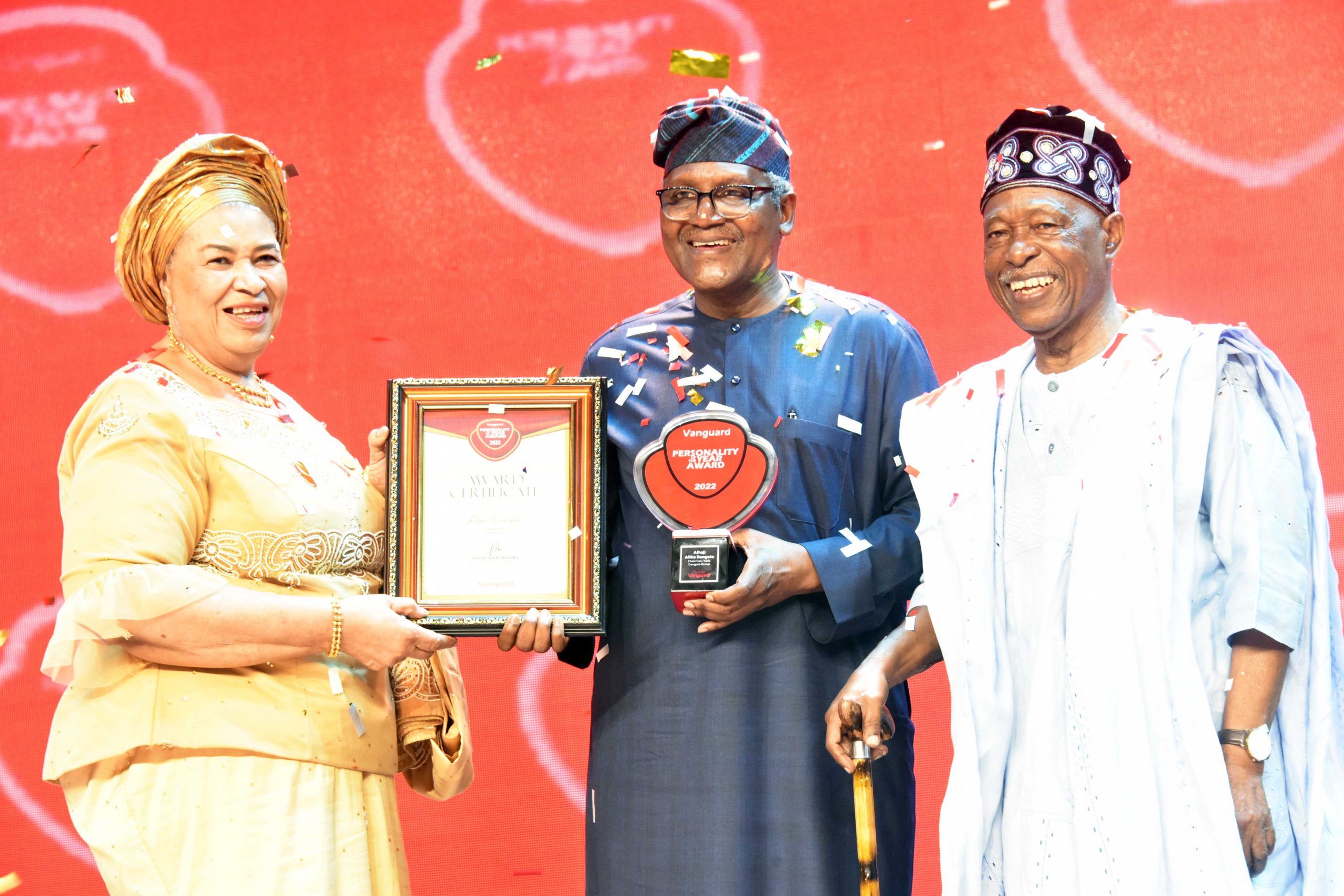 Cover Pix: L–R, Chairman of Occasions, Mrs. Ajoritsedere Awosika, President/CE, Dangote Industries limited, Aliko Dangote, with the Vanguard 2022 Personality of the year Award, Publisher of Vanguard Newspapers, Sam Amuka, at the Vanguard Newspapers 2022 Awards in Lagos on Friday 27th January 2023