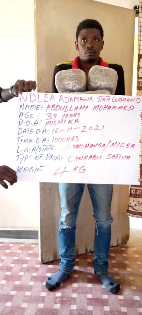 A suspected fake security agent, Abdullahi Mohammed, who claimed to be serving in one of the security formations in Mubi, Adamawa state was arrested with four blocks of Cannabis Sativa weighing 4kg along Bazza- Michika road. In the same vein, four other suspects were arrested at different locations in Jimeta, Yola North LGA, with assorted substances such as Cannabis, Diazepam, Exol- 5 and Tramadol tablets.
