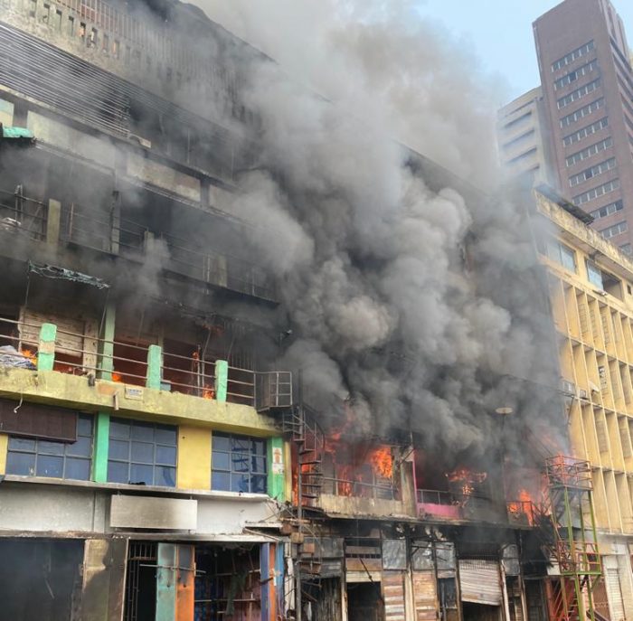 “The fire escalated to adjoining buildings totaling seven (7) in number and is being contained by the Emergency responders i.e LASG Fire Service and the Federal Fire Service and NPA Fire Service. Seven buildings are affected and two have collapsed.