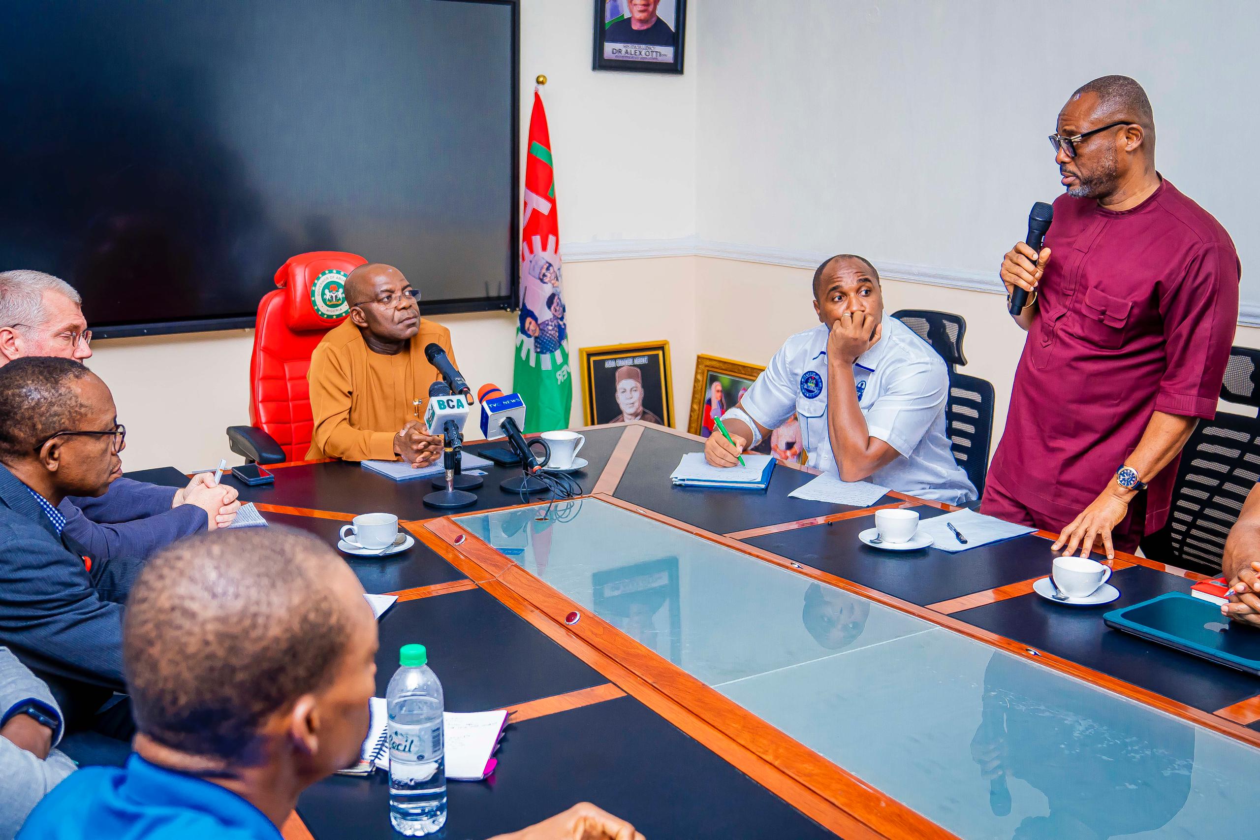 Governor Otti listening to the General Manager, Greater Aba Development Authority (GADA), Arc Uche Ukeje, speaking during the meeting. Observing and seated right is the Commissioner for Lands and Housing, Mr. Chaka Chukwumerije.