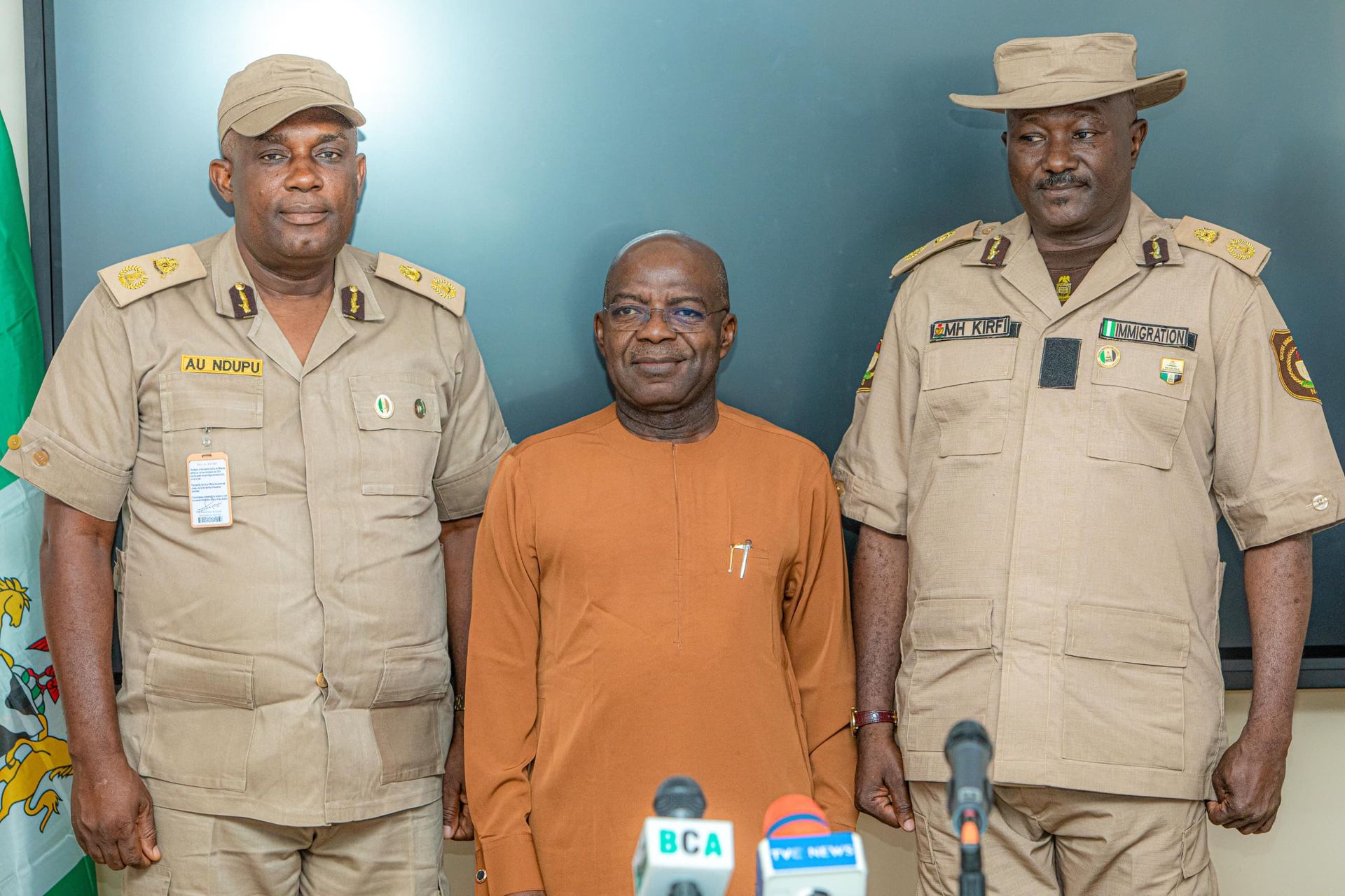Cover pix: Governor Otti with the outgoing immigration boss, CIS Ndupu (left), and the incoming CIS, Mohammed Kirfi (right).