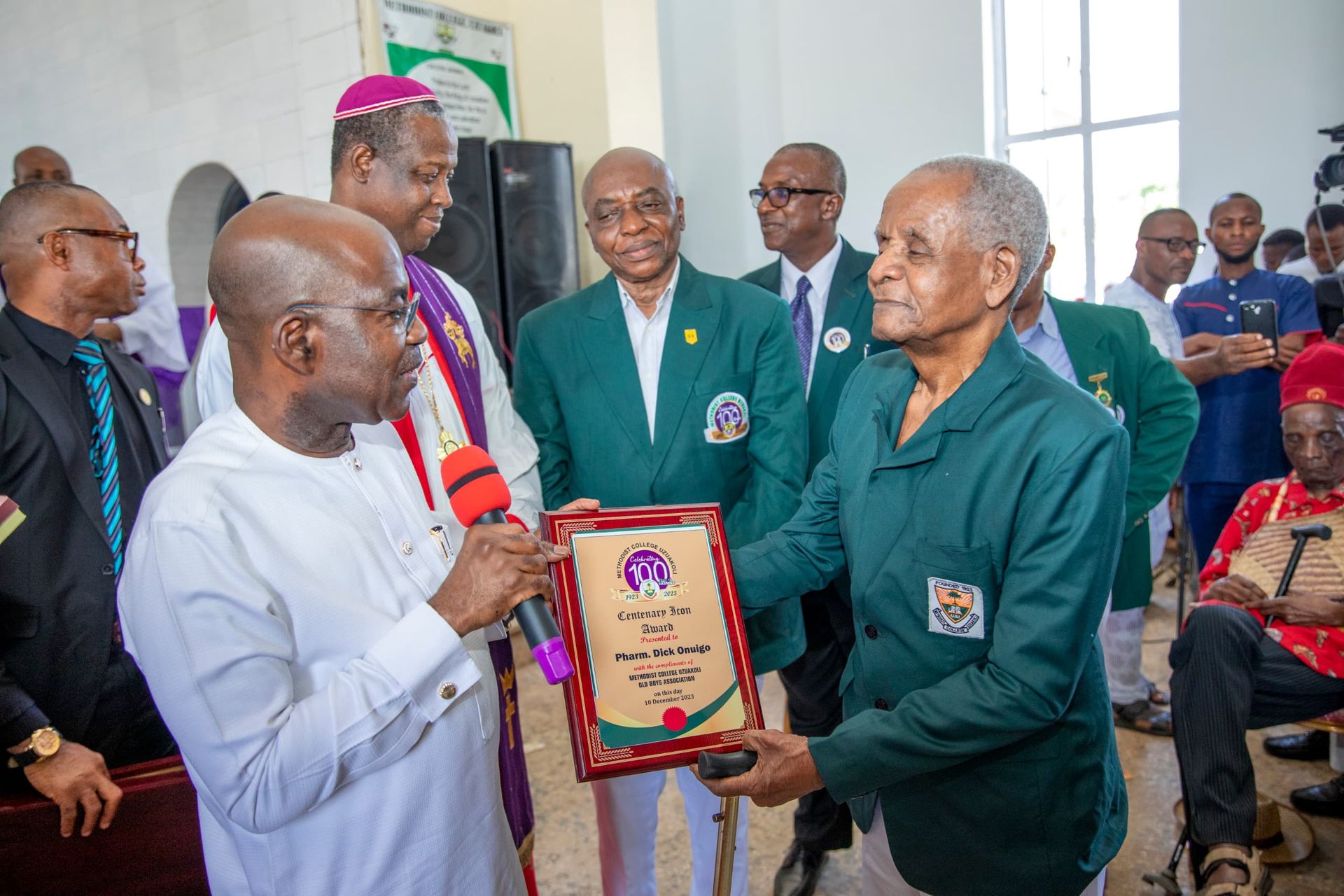 Cover pix: Governor Otti presenting a plaque to the oldest surviving Old Boy, Pharm Dick Onuigo, 99 years old.