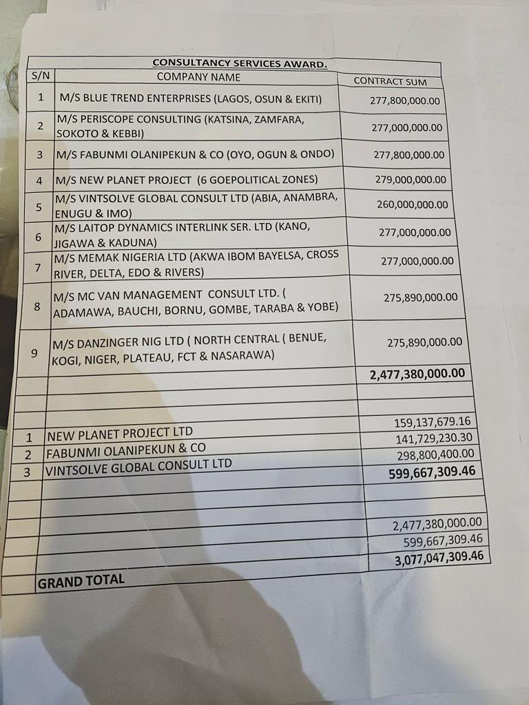 Laitop with registration number 1340092, is owned by one Quburat Bolanle Bolanta. It was registered on June 6, 2016. Memak Nigeria Limited with no known ownership and date of registration got NN277million. MC Van Management Consult Limited with no records of registration also got N275.8million contract while Danzinger Nigeria Limited with registration number 635448, registered on Sep 23, 2005got N275.8million. Danzinger is owned by one Oladapo Rotimi Mohammed.