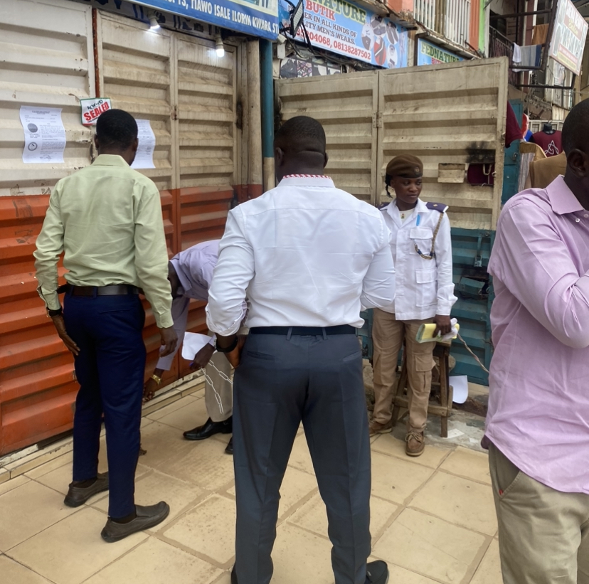 Cover pix: KWIRS officials, alongside shutting down God First’s shop in Taiwo Isale road of Ilorin, Kwara state. Photo: Mustapha Usman/The ICIR