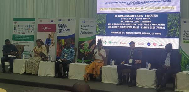 Cover Pix: Julius Berger’s Cashew Project’s Commodity and Marketing Manager, Oyindamola Asaaju (middle and with the microphone) making a point during the panel session on Standardized Production & Processing Methods at TVET Cashew Conference in Abuja recently