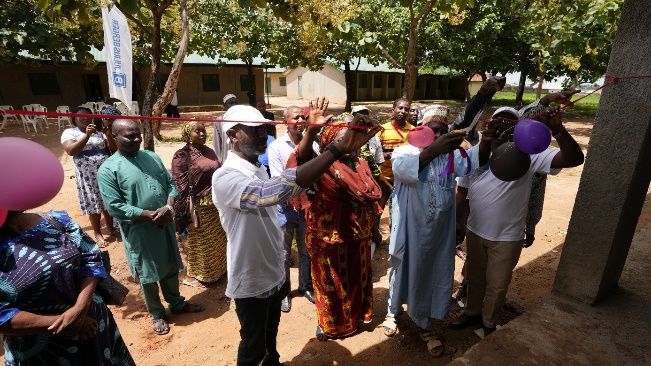 Cover Pix: Head of Dullu Tafa District, James Bitrus cutting the ribbon to inauguate the newly constructed classroom block donated by Julius Berger Nigeria Plc to Government Senior Day Secondary School, Dullu Tafa, Kagarko LGA in Kaduna State, recently.