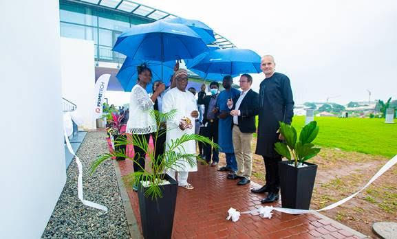 PrimeTech Chairman, Hon. Engr. Jafaru Damulak cuts the tape to commission Primetech’s new building extension while the JBN financial Director, Christian Hausemann, PrimeTech Gm, Christian Mossmer, and other officials look on with interest.