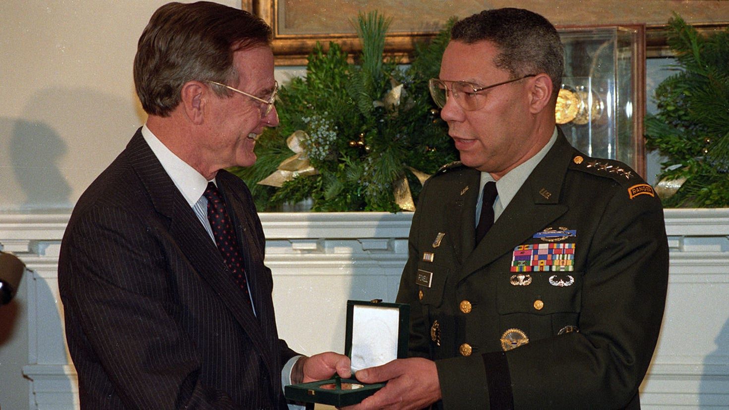 President Bush presenting Joint Chiefs of Staff Chairman Gen. Colin Powell with a Congressional Gold Medal at the White House in 1992. (REUTERS/Gary Cameron, File)