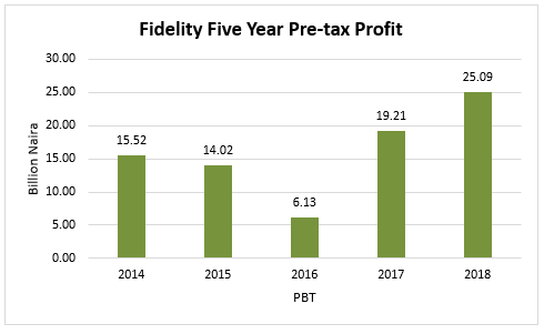 Alabingo Finance Report| In spite of the tough operating environment, Fidelity Bank posted a 30.6 per cent growth in pre-tax profit to N25.1 billion in 2018 financial year, bolstered by significant drop in impairment charges on non-performing loans and higher revenue, which was strengthened by interest income on liquid assets and electronic banking income.