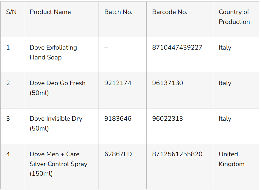 According to NAFDAC’s Public Alert No. 018/2025, the European Union authorities have banned the marketing and sale of Dove Exfoliating Hand Soap (100g) and several Dove deodorant products in Brussels, Belgium, after confirming the presence of a banned ingredient.
