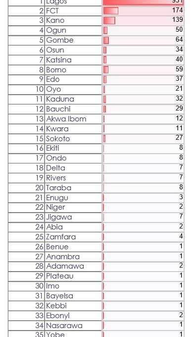 According to the health agency, Lagos, the epicentre of the disease in the country recorded 87 new infections. The other states include Kano, 24, Gombe 18, Kaduna 17, FCT 16, Katsina 10, Sokoto 8, Edo 7, Bornu 6, Yobe 1, Ebonyi 1 and Adamawa 1.