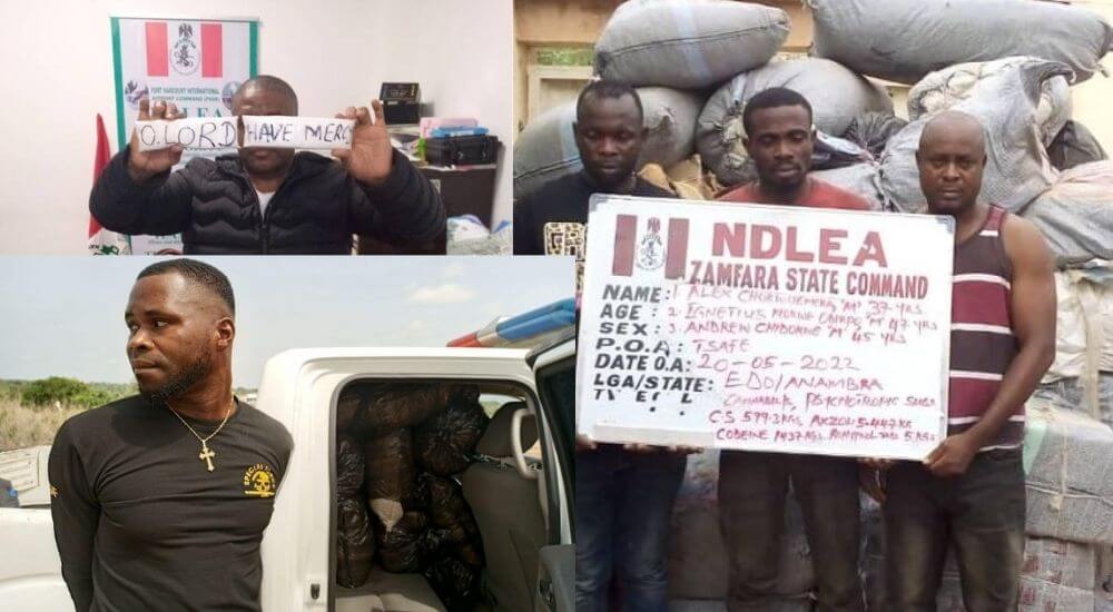 In Kogi State, a fake security agent, Richard Agada was arrested on May 18 while conveying 10 bags of Cannabis Sativa weighing 116.8kg in a white Nissan van.