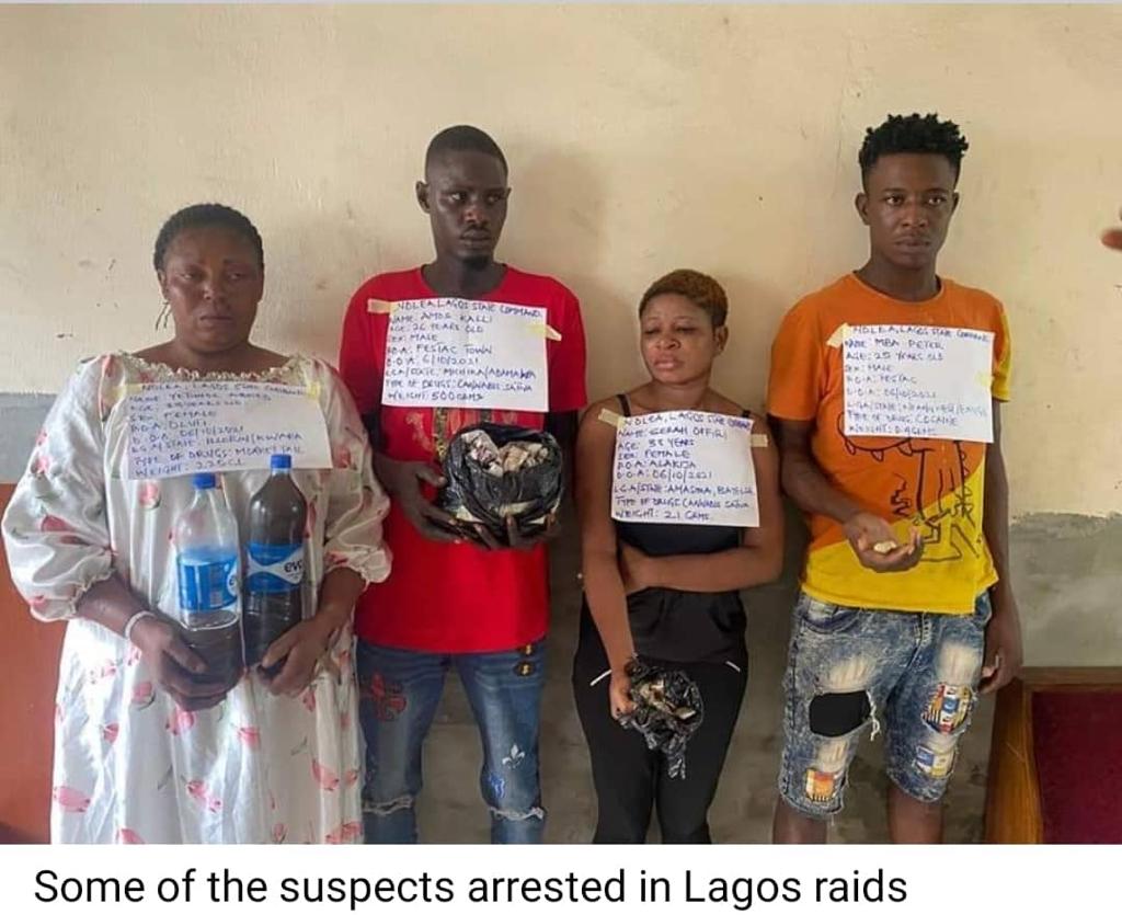 In Lagos, notorious drug joints in Maza Maza, Alakija, Festac town, Amuwo Odofin, Oluti, Isheri roundabout, and Igando were raided on Thursday 7th October, 2021, when at least 16 suspects were arrested. They include: Lucky Elibe; Abdullahi Jabir; Amos Kalli; Nweke ThankGod; Tukwosi Arowolu; Odinaka Oramu; Jeremiah Ishaya; Maxwell John; Usman Garba; Christian Okibe; Mba Peter; Sarah Offiri; Wasiu Adeniji; Bode Olaitan; Yetunde Ahmed; and Abdullahi Jibril.