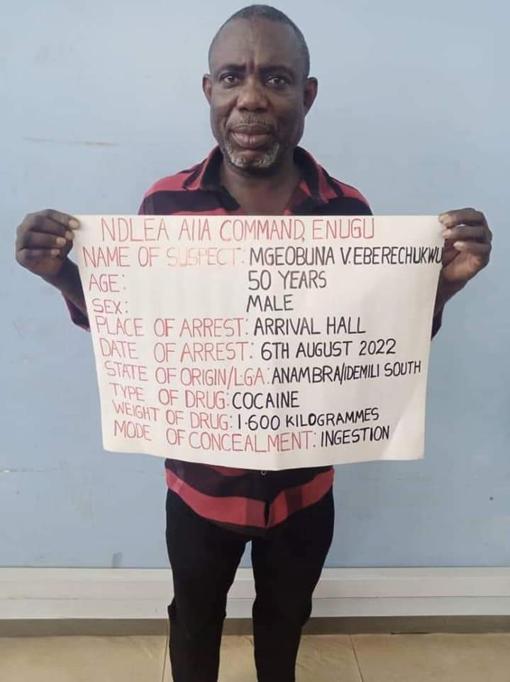 Anti-narcotic officers at the Akanu Ibiam International Airport, Enugu have arrested a 50-year-old Mgbeobuna Victor Eberechukwu for ingesting 77 pellets of cocaine.