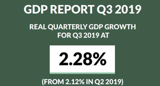 Nigeria’s gross domestic product (GDP) grew by 2.28% in the third quarter of 2019, data released by the National Bureau of Statistics showed.
