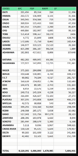 According to results presented by state collation officers for the presidential election (SCOPs) before the Chairman of the Independent National Electoral Commission, Mahmood Yakubu, at the National Collation Centre in Abuja, Tinubu polled 8,120,391 from 32 states and the FCT.