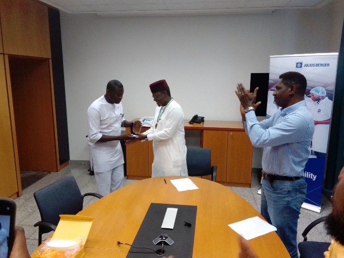 Cover pix : The Award recipient and Julius Berger’s Director of Administration, Alh. Dr. AbdulazizIsa Kaita receiving the plaque from the leader of NANS delegation, Daniel Friday Eggawhile while the Julius Berger’s Head, Corporate Communications, James Agama applauds.