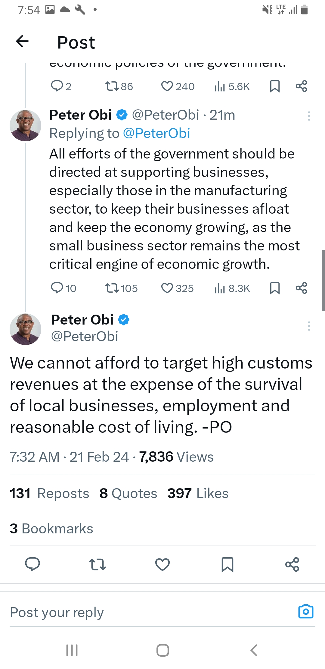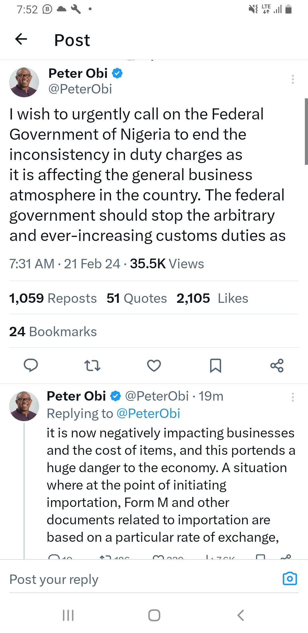 “I wish to urgently call on the Federal Government of Nigeria to end the inconsistency in duty charges as it is affecting the general business atmosphere in the country. The federal government should stop the arbitrary and ever-increasing customs duties as it is now negatively impacting businesses and the cost of items, and this portends a huge danger to the economy”, Obi said.