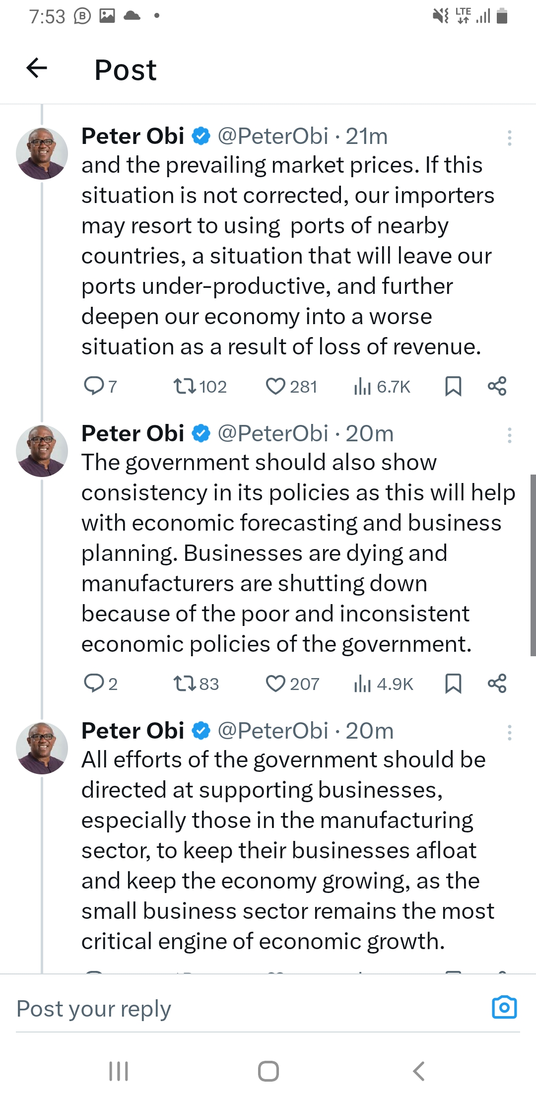 Obi further stated that the government should also show consistency in its policies as this will help with economic forecasting and business planning.