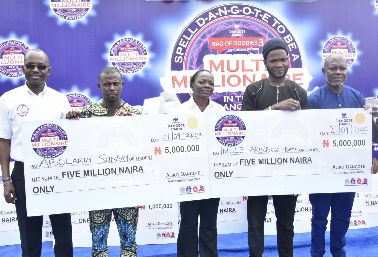 L-R: Dangote Cement plc Regional Sales Director, Lagos/Ogun, Dolapo Alli, One of the Five million winners, Abolarin Sunday, Dangote Cement plc, Deputy Regional Director Lagos/ Ogun Folake Ojo, One of the Five Million Winner, Imole Akinbode Bayo, National Lottery Regulatory Commission Principal Administrative Officer, Afam Ojeh, at the Dangote Cement Consumer Promo Bag of Goodies 3, presentation of prizes to the winners in Sagamu, Ogun state on Wednesday, September 21, 2022