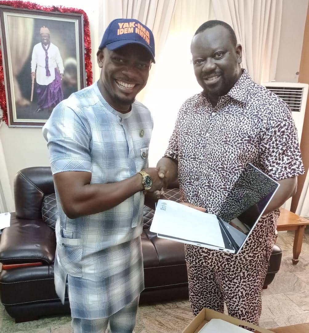 Chidi Tony/ In his avowed determination to ensure the success of Bring Back Our Language Foundation project, the Principal Founder & Advisor of Wodiong Senie Foundation, Obong Ide Owodiong-Idemeko yesterday donated a brand new Laptop to the International President of Bring Back Our Language (BBOL) Foundation, Imaan Mike Umoh.