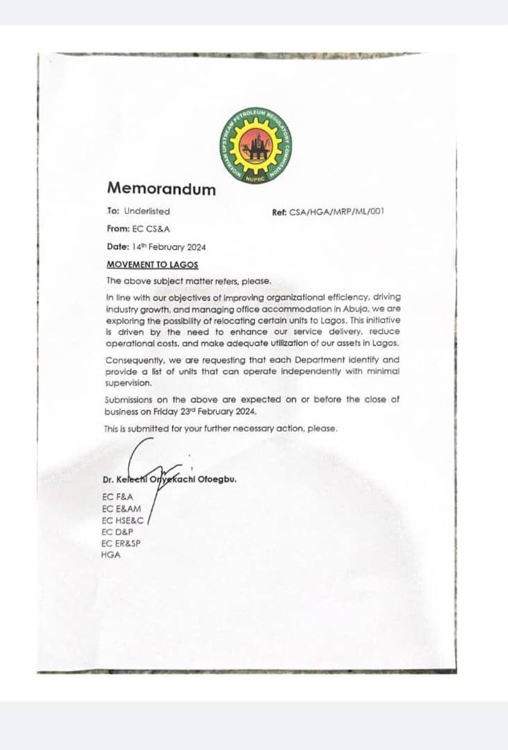 Our reporter/ The Nigerian Upstream Petroleum Regulatory Commission is considering relocating some of its units to Lagos, according to a document seen by Channels.