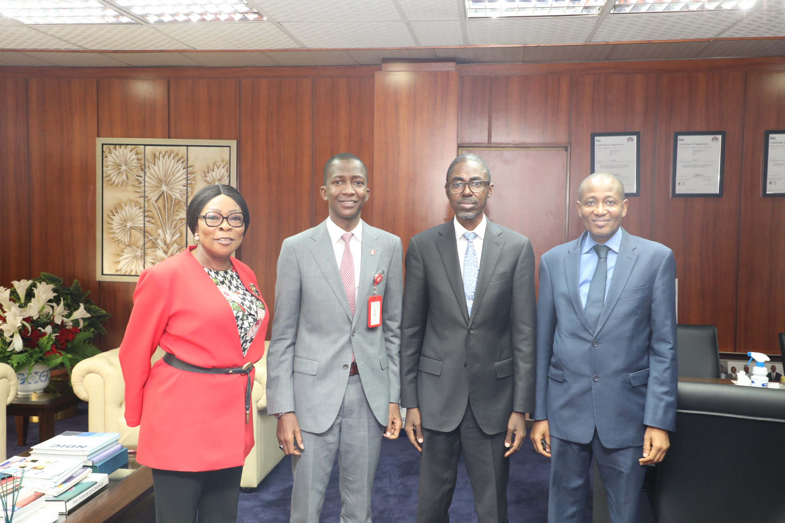 L-R Executive Director (Corporate Services) NDIC, Hon. (Mrs.) Omolola Abiola Edewor; Chairman EFCC, Abdulrashid Bawa; MD/CEO NDIC, Bello Hassan and Executive Director (Operation) NDIC, Mustapha Mohammed Ibrahim, during a courtesy call to the NDIC Senior Management in Abuja by the Chairman EFCC