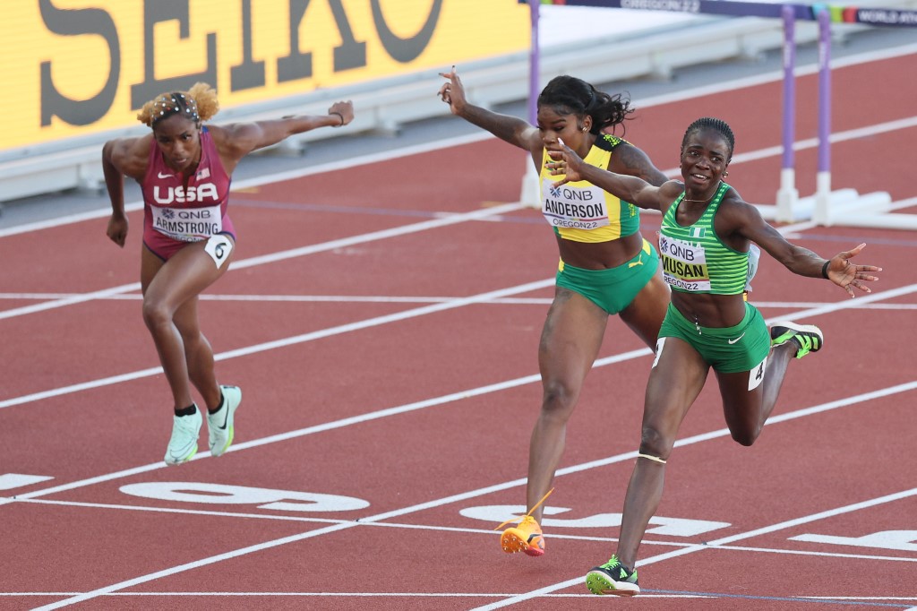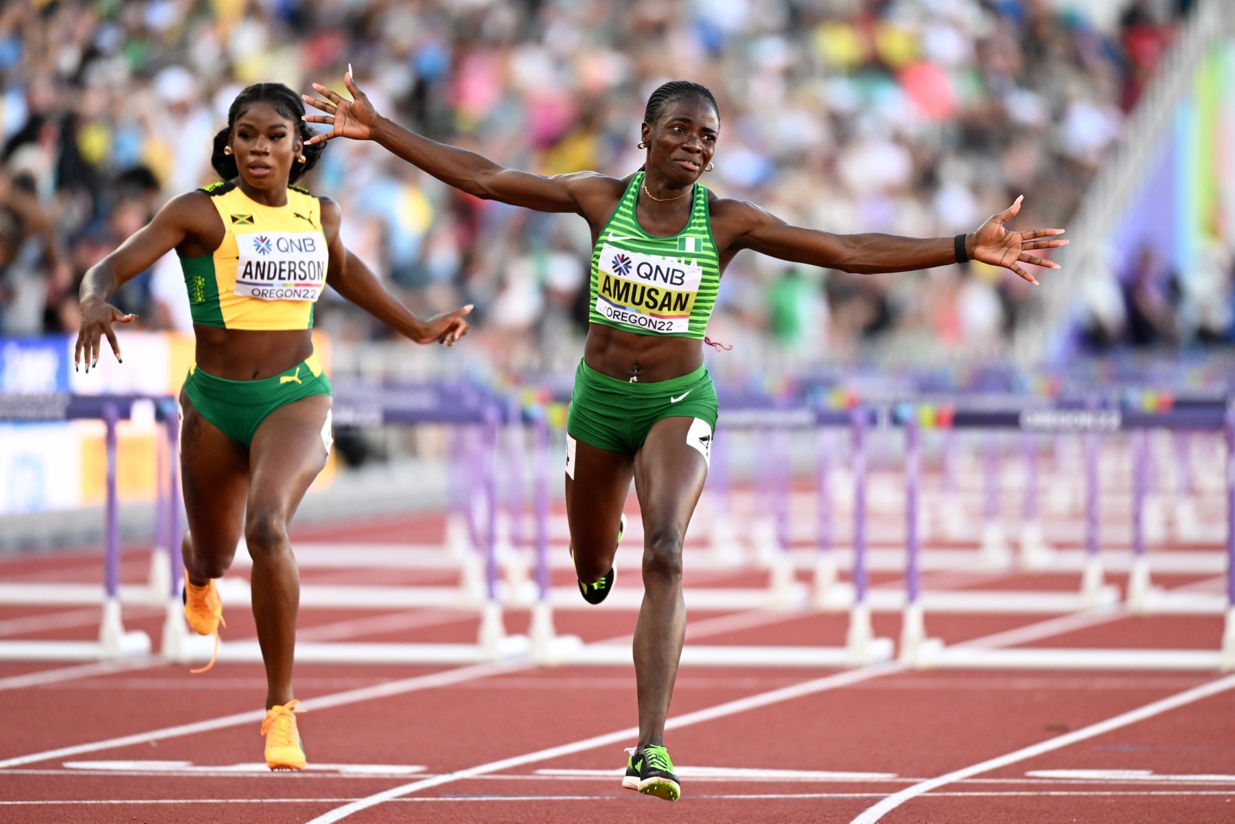 Jamaica’s Britany Anderson and Olympic champion Jasmine Camacho-Quinn of Puerto Rico settled for the silver and bronze medals after finishing the race behind Amusan.