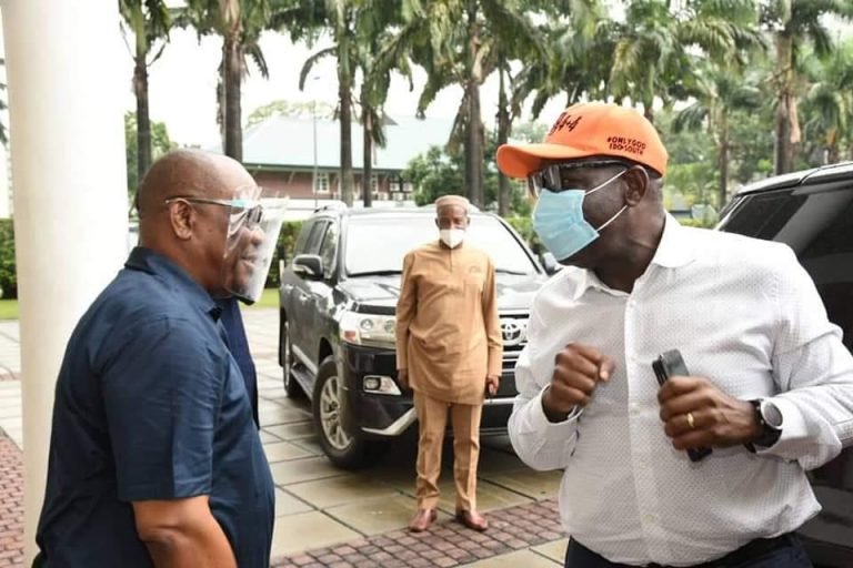 Embattled Edo state governor, Godwin Obaseki on Sunday visited Nyesom Wike, governor of Rivers state, at the government house in Port Harcourt.