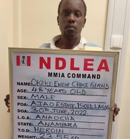 The National Drug Law Enforcement Agency (NDLEA), on Sunday, said its operatives intercepted 22 blocks of heroin weighing 23.55kilograms concealed in packs of Nestle Cerelac baby food at the Murtala…