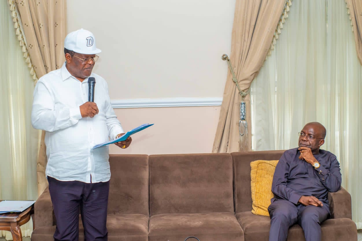 Cover pix: Minister of Works, Engr David Umuahi, addressing Governor Otti during his visit.